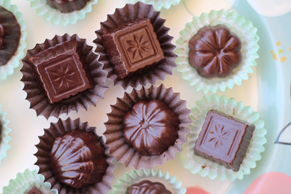 5. بواسطه ملعقة صغيرة يسكب في قالب خاص للشوكولاتة بأشكال مختلفة
