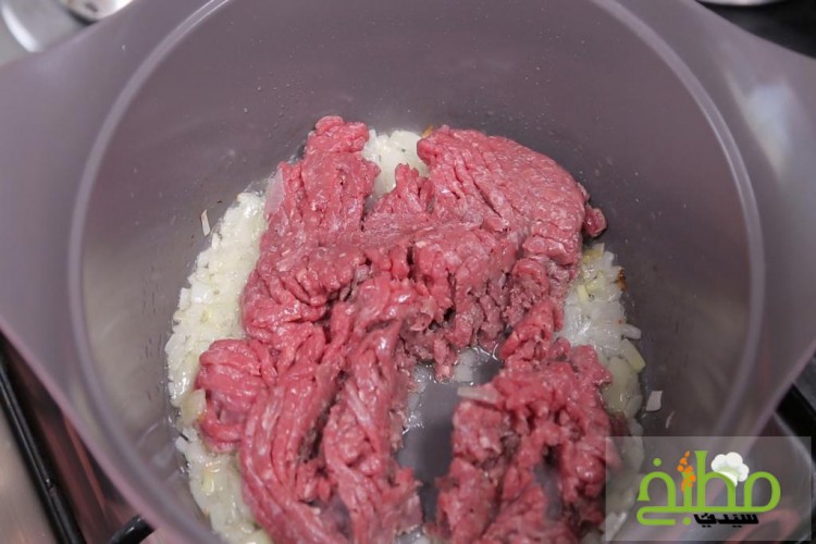 ضعي الزيت، والبصل واللحم المفروم بقدر على النار وقلبي حتى يتغير لون اللحم ويبدأ بالنضوج