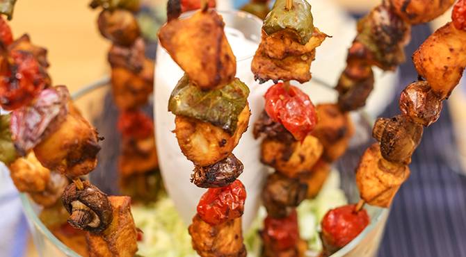 استعملي أسياخ خشبية أو معدنية، شكي الدجاج بالتبادل مع الخضراوات، ضعيهم على الصينية ثم باستعمال فرشاة امسحيهم بقليل من زيت الزيتون( يمكن استعمال زيت بخاخ لتسهيل توزيعه على الدجاج.)