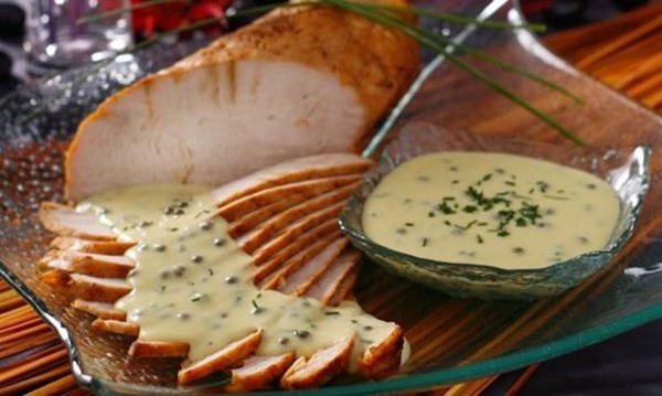 7. يقطع صدر الديك إلى شرائح، بعد أن يبرد تماماً، ترص في طبق التقديم ويسكب قليل من الصلصة فوقها. وتقدم الكمية المتبقية من الصلصة في وعاء منفصل.