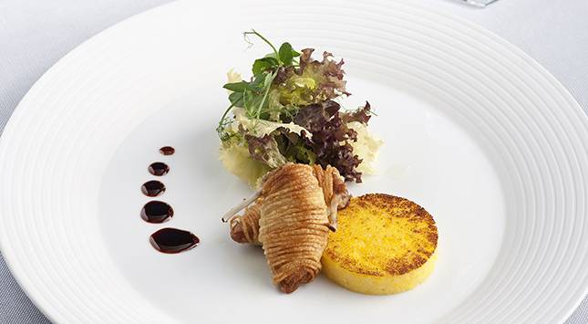 يُشوح الحمام الملفوف في مقلاة ساخنة حتى يكتسب اللون الذهبي.