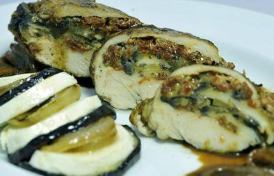 حلقة باذنجان ثم ترش بطبقة من الجبن ، وتكرر الطبقات حسب الرغبة - تربط صدور الدجاج بالخيط ليحكم غلقها، وتُكرر العملية مع الصدور الآخرين