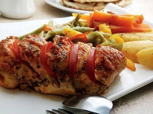 - رشى الملح والبهارات على صدور الدجاج ثم اعملى4 إلى 5شقوق مائلة في كل صدر دجاج دخلى شريحة طماطم في كل واحد من الشقوق وإضافة إلى الثوم المهروس وأوراق الريحان طازج وادهنى صدور الدجاج بالزيت ويرش عليها زعتر .