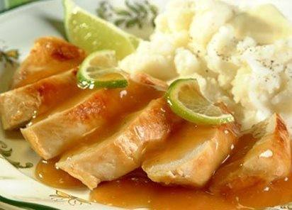 - في وعاء التقديم نضع صدور الدجاج وتقطع وتسكب عليها الصلصة .