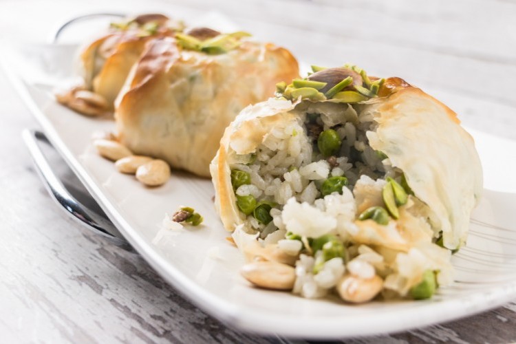6. املئي العجينة بالحشوة واثني أطراف العجينة على الأرز لتغطّيه تماماً.