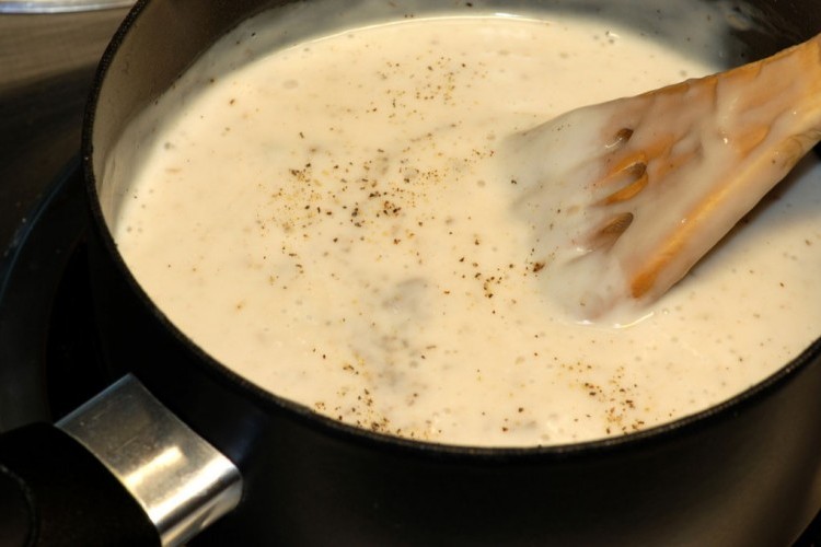 3. صبي الحليب بالتدريج مع التحريك المستمر حتى يتشكل لديك صلصة سميكة وكثيفة.