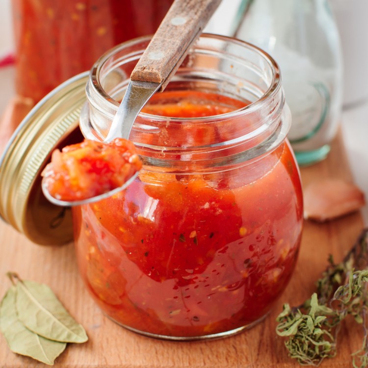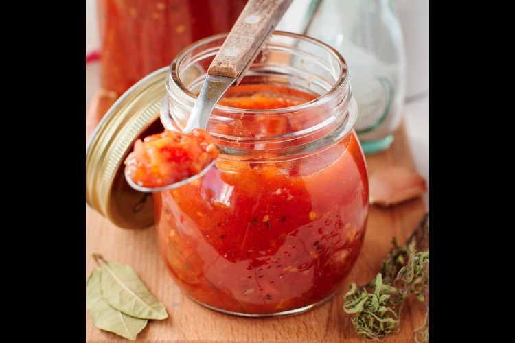 2- نضيف صلصة الطماطم إلى الثوم، ثمّ نملئ علبة الطماطم بالماء، ونصبها فوق القدر.