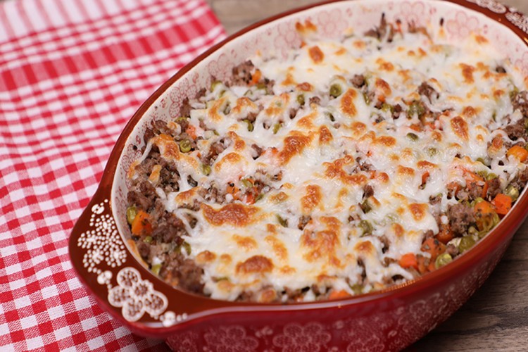 5. وزعي اللحم المفروم فوق البطاطس المهروسة، ورشي جبن الموزاريلا المبشور.