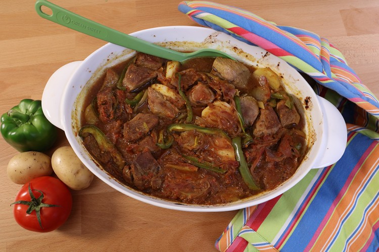 6. ضعي خليط اللحم فوق البطاطس، يمكنك إضافة كوبين من الماء وذلك حسب نوع اللحم.