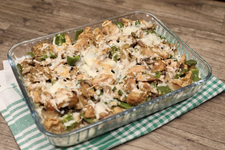 6. انثري جبن الموزاريلا المبشور فوق طبقة الدجاج.