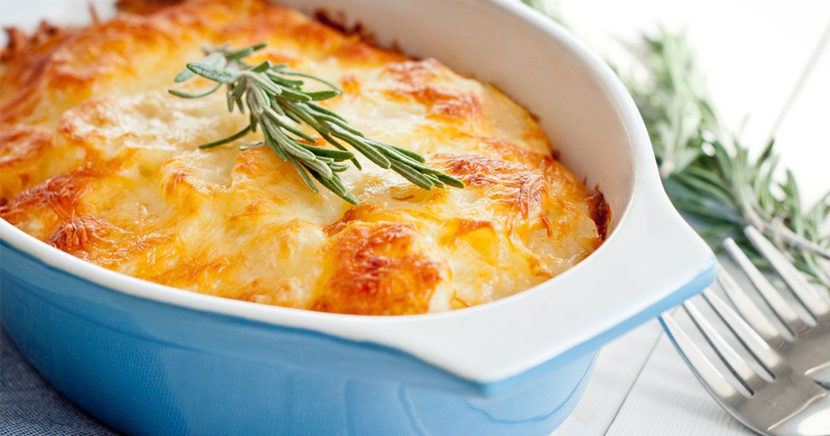 8- وزعي خليط الدجاج في صينية فرن ثم ضعي كرات البطاطس. أسكبي صلصة البشاميل على وجه الصينية ثم انثري جبن الموزاريلا.