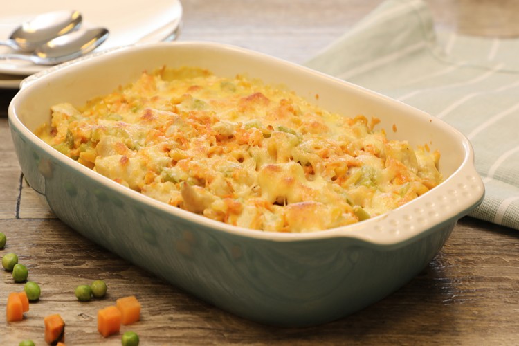 - وزعي البطاطس المقلية في طبق الفرن ووزعي مزيج الدجاج فوقه مع الكريمة.