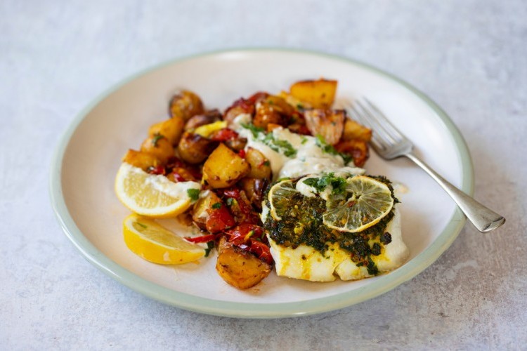6. يقدم السمك مع صوص الطحينة والحمص وسلطة الأعشاب.