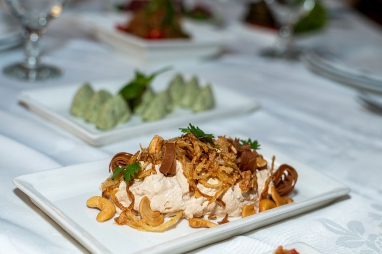 - يقدم السمك مع صوص الطحينة والحمص وسلطة الأعشاب.