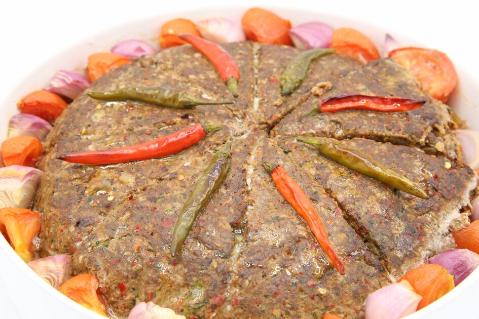 ضعي البصل والطماطم بالتبادل علي جوانب الكفتة بحيث تكون ملاصقة لحواف الصينية.