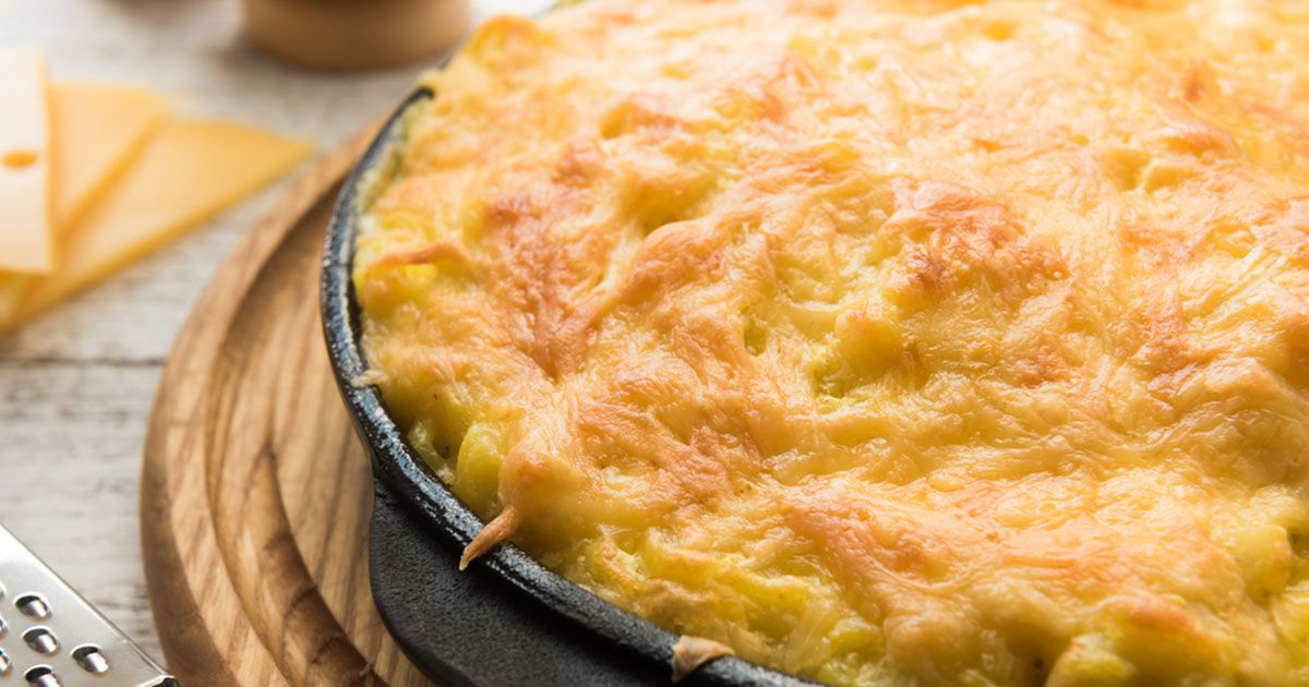 6- ضعي مزيج المعكرونة في صينية فرن. أنثري الجبن على الوجه.