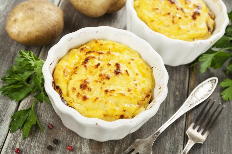 - ادهني طبق الفرن بالقليل من الزبدة ثم وزعي البطاطس المهروسة فيه.