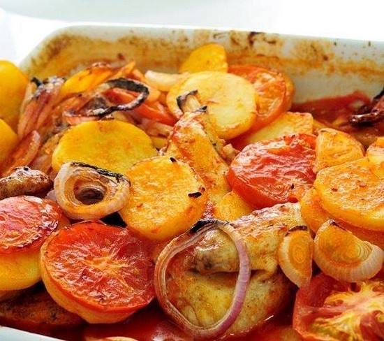 - يُقشر المقدار المتبقي من البصل ويُقطع إلى شرائح، وتُرص فوق البطاطس والدجاج بالتبادل مع شرائح الطماطم.