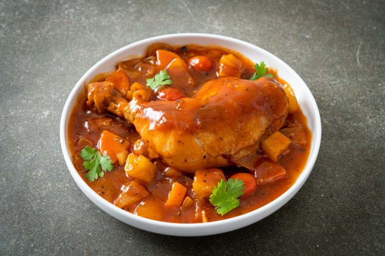 - يسكب مرق الدجاج ثم عصير الطماطم.