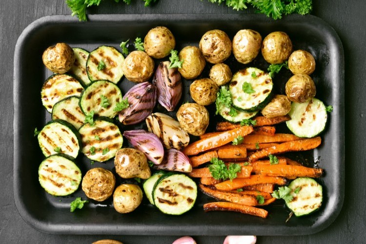 - ضعي مزيج الخضار في طبق الفرن ووزعي الماء وغطي الطبق بورق الأولمنيوم.