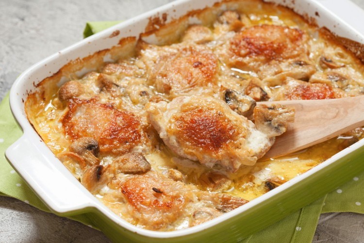 - ضعي أفخاذ الدجاج على البصل وغطّيها بالكريمة الطازجة.
