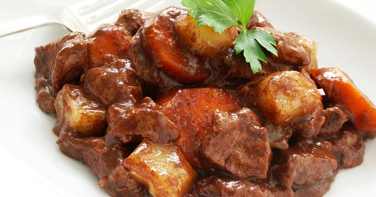 5- إدهني صينية فرن بالزبدة. ضعي فيها قطع البطاطس، الجزر واللحم.
