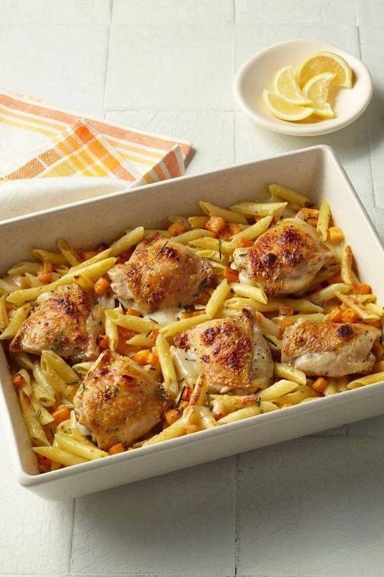 9.  تُرص قطع الدجاج أعلى المكرونة، ويُنثر عليها أوراق الروز مارى الطازجة.