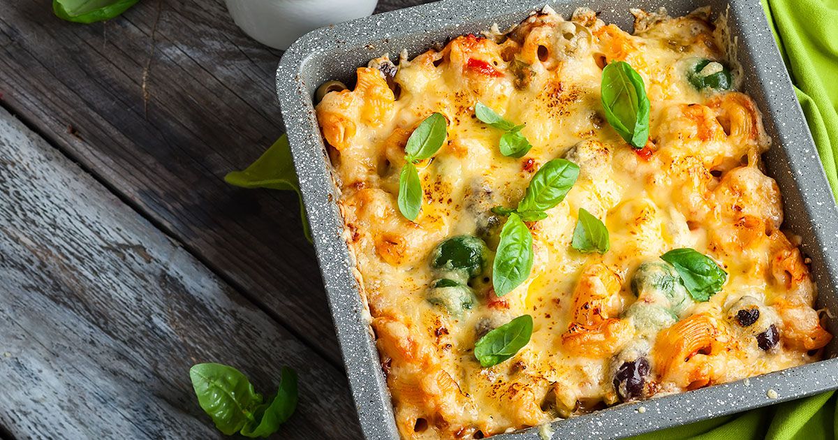 4- ضعي المعكرونة في صينية فرن. أسكبي فوقها مزيج الطماطم والخضار. زيدي الزيتون والجبن على الوجه.