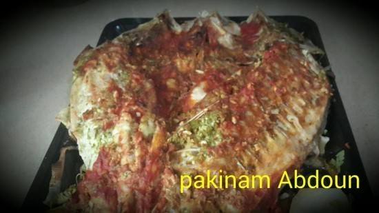 3. وندهنها من الوجه والظهر بالتتبيلة ونتأكد ان كل السمكة اخذت من التتبيلة وندخلها الفرن على درجة حرارة 200 حتى تستوى ونقدمها .