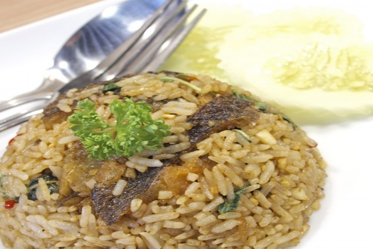 6. للأرز: يُضاف الزيت إلى قدر أخرى، فالأرز، مع التقليب لثلاث دقائق. ثمَّ، يضاف البصل وقطع السمك المقليّة. يُنثر الملح.