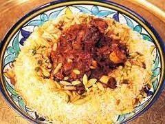 4. ضعي البصل المقلي واللوز ومن ثم صلصة اللحم المتبقية وتخفف بالزعفران المنقوع وتضاف إلى الخليط
