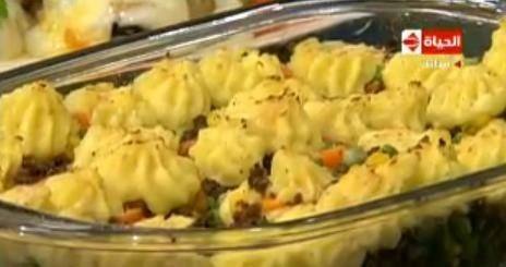 وفي صينية بايركس ضعي خليط اللحم ثم ضعي البطاطس في كيس الكريم شانتيه
