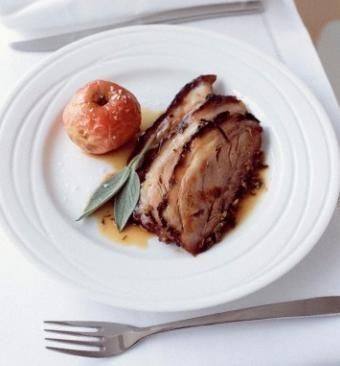 - يقطع اللحم 4 شرائح سميكة توزع على 4 أطباق مع وضع كل تفاحة في طبق