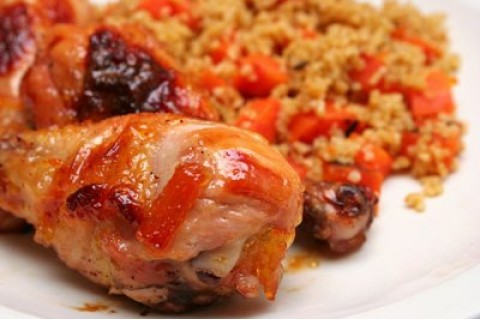 - يوضع نصف مقدار الفريك فى طاجن ثم ترص شرائح الدجاج ثم باقى الفريك .