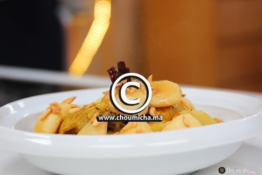 - تصفف أفخاذ الدجاج في طاجين مسخن، تسقى بالمرق وتزين بأرباع التفاح وباللوز المحمص المجروش.