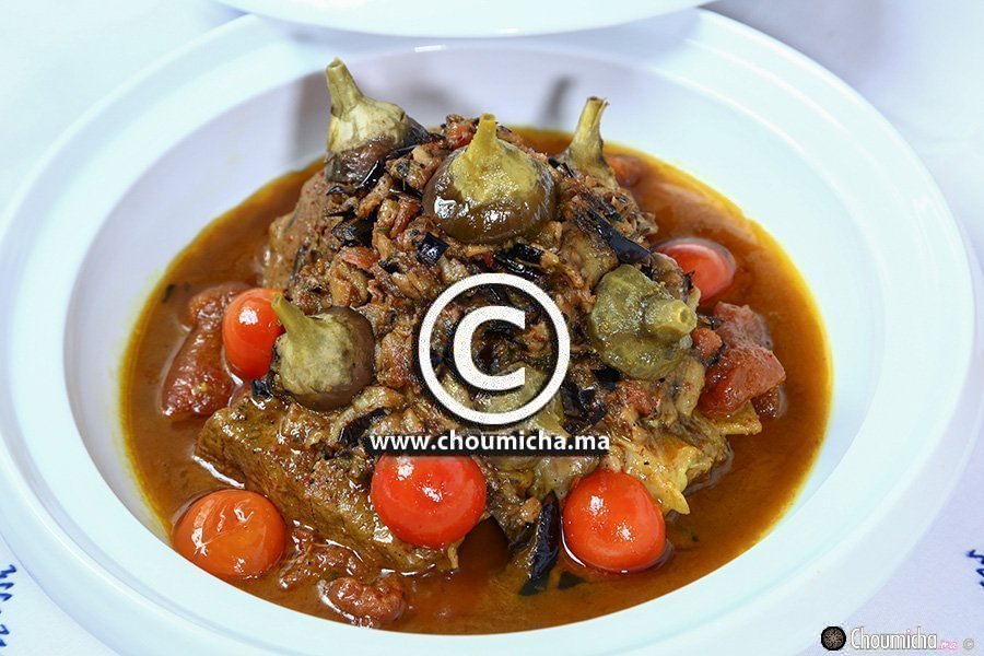 - يوضع اللحم في طاجين مسخن، يسقى بالمرق ويزين بالباذنجان المفروم.