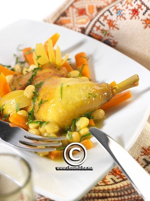 • يقدم الدجاج مزينا بالجزر والحمص ومسقيا بالمرق.