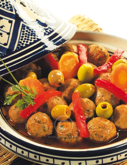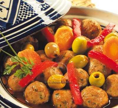 - تصفف كويرات السمك فوق الخضر تزين بالزيتون الأخضر وشرائح الفلفل الأحمر. يغطى الطاجين ويترك ينضج لمدة 10 دقائق. يقدم الطاجين ساخنا.