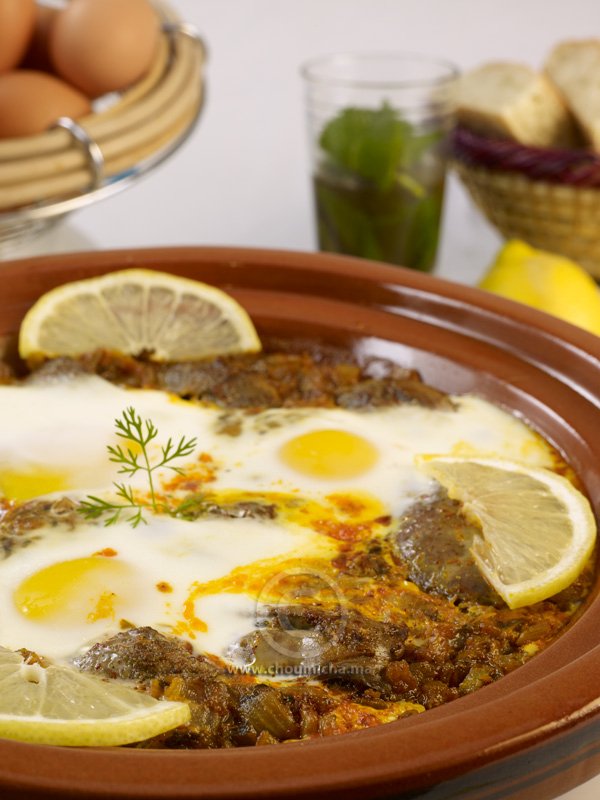 - يقدم طاجين البيض والكبد مزينا بشرائح الليمون الحامض.