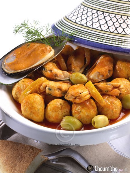 - تسكب الصلصة في طاجين وتصفف فوقها كويرات السمك، بلح البحر والزيتون.