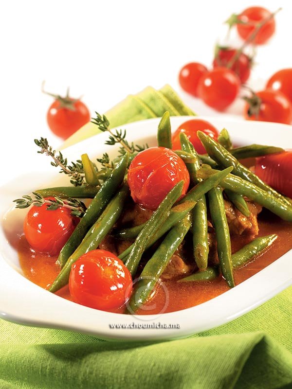 طاجين لحم الغنم بالفاصوليا الخضراء والطماطم الصغيرة