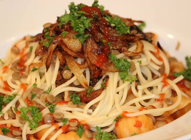 طبق مبتكر من المعكرونة مع العدس الأسمر بالبصل المحمر