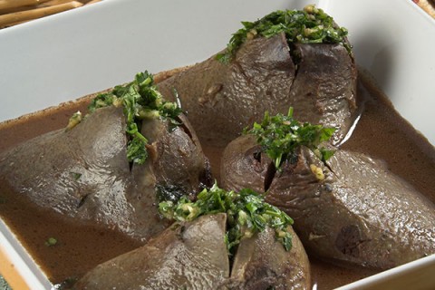 - ضعي قطع الطحال في الطبق الجزء المحشي للأعلى. أضيفي بقية زيت الزيتون، الماء و عصير الليمون.