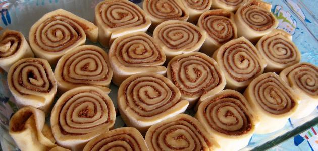 - إحضار العجينة وفردها على سطح مغطّى بطحين، وتوزّع الحشوة عليها ويتمّ لفّ العجين على شكل رول طويل؛ ليقطّع إلى مجموعة من القطع مختلفة الأحجام باستخدام سكين.
