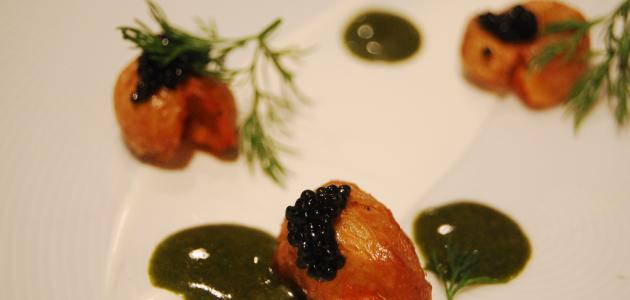 - يُدهن سطح حبّات البطاطا بخليط الكريمة، ثمّ توضع عليها حبات الكافيار وتقدّم إلى جانب السلطات.