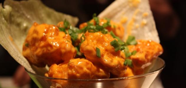 - تغطيس قطع الجمبري بالصلصة المحضرة، وترتيبها في طبق التقديم.