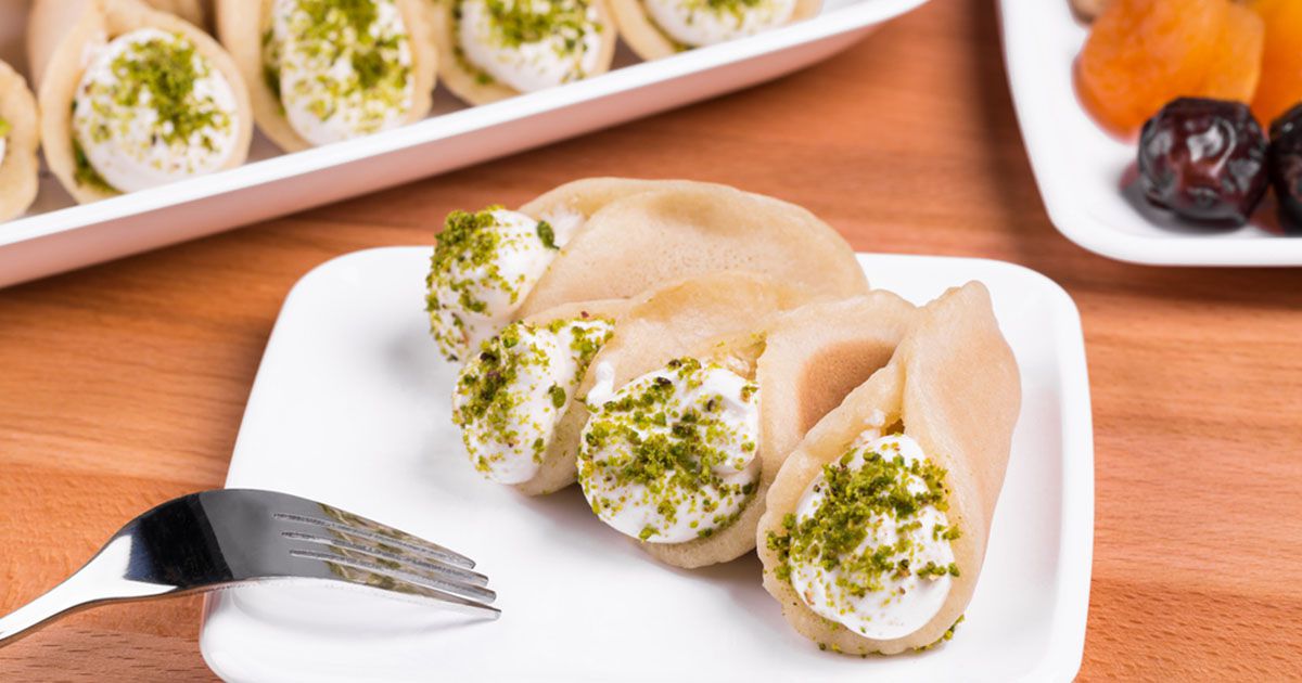 5- خذي قطعة من العجين واحشيها بالقشطة. أغلقي العجينة من جهة واحدة. كرّري العملية حتى انتهاء الكمية. قدّمي القطايف على سفرتك. ألف صحة!