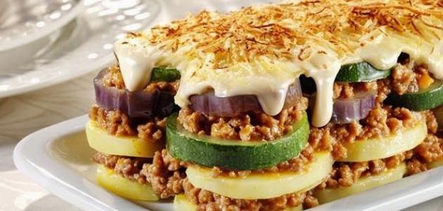 - صفّي المكونات مرتّبة في طبق التقديم، بحيث تضعين الخبز، ثمّ توزعين ثلث كمّيّة صلصة اللّبن، ثمّ توزّعين الباذنجان والفلفل، ثمّ توزّعين الثلث الثني من اللّبن، ثمّ توزّعين خليط الطماطم واللحم، ثمّ تضعين ما تبقى من اللّبن، وزيّني السطح بالبقدونس، وقدّميها مباشرة.