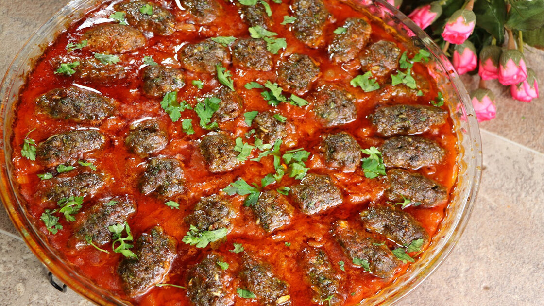 ونبدأ في خلط المفروم ويعمل كرات ويوضع على الخليط، ثم يرفع على النار ونضيف القليل من الماء حتى يساعد على طهو اللحم.