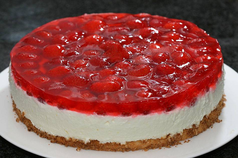 - 3 يُسكب مزيج القشطة الساخن فوق صينية الكعكة المُعدّة، يوضع جانبًا ليبرد و يُصبح بحرارة الغرفة العادية، تُنسّق الفراولة فوق مزيج القشطة.